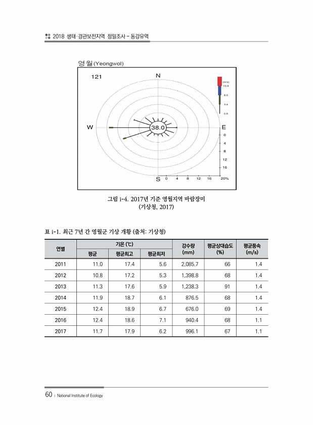 2018 생태·경관보전지역 정밀조사 동강유역 60 ? National Institute of Ecology 그림 i-4. 2017년 기준 영월지역 바람장미 기상청, 2017 연별 기온 ℃ 강수량 mm 평균상대습도 % 평균풍속 평균 평균최고 평균최저 m/s 2011 11.0 17.4 5.6 2,085.7 66 1.4 2012 10.8 17.2 5.3 1,398.8 68 1.4 2013 11.3 17.6 5.9 1,238.3 91 1.4 2014 11.9 18.7 6.1 876.5 68 1.4 2015 12.4 18.9 6.7 676.0 69 1.4 2016 12.4 18.6 7.1 940.4 68 1.1 2017 11.7 17.9 6.2 996.1 67 1.1 표 i-1. 최근 7년 간 영월군 기상 개황 출처...