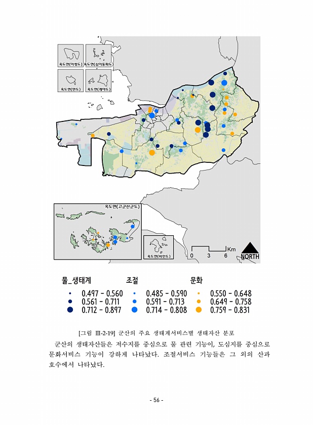 [그림 Ⅲ-2-19] 군산의 주요 생태계서비스별 생태자산 분포 군산의 생태자산들은 저수지를 중심으로 물 관련 기능이, 도심지를 중심으로 문화서비스 기능이 강하게 나타났다. 조절서비스 기능들은 그 외의 산과 호수에서 나타났다. 56