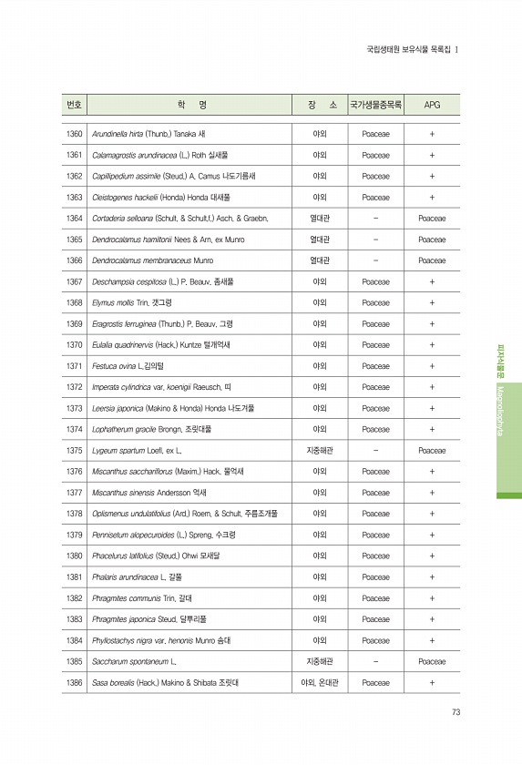 73 번호 학 명 장 소 국가생물종목록 APG 피자식물문 Magnoliophyta 국립생태원 보유식물 목록집 Ⅰ 1360 Arundinella hirta Thunb. Tanaka 새 야외 Poaceae + 1361 Calamagrostis arundinacea L. Roth 실새풀 야외 Poaceae + 1362 Capillipedium assimile Steud. A. Camus 나도기름새 야외 Poaceae + 1363 Cleistogenes hackelii Honda Honda 대새풀 야외 Poaceae + 1364 Cortaderia selloana Schult. & Schult.f. Asch. & Graebn. 열대관 Poaceae 1365 Dendrocalamus hamiltonii Nees & ...