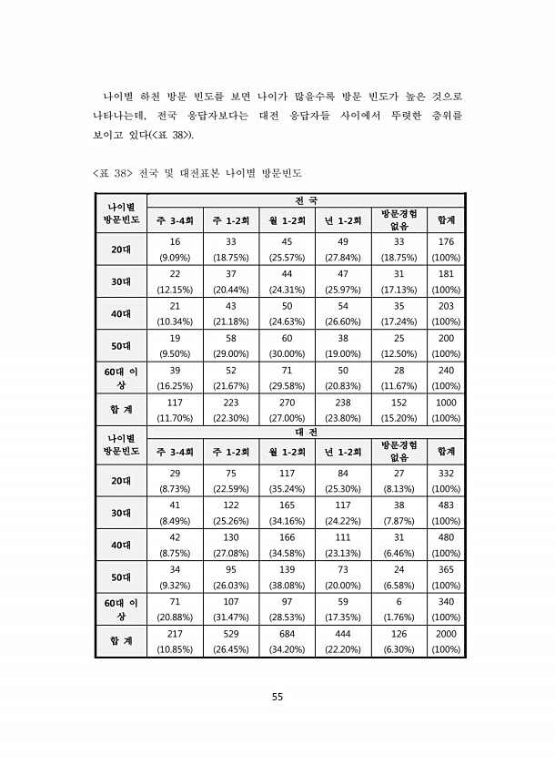 55 나이별 하천 방문 빈도를 보면 나이가 많을수록 방문 빈도가 높은 것으로 나타나는데, 전국 응답자보다는 대전 응답자들 사이에서 뚜렷한 층위를 보이고 있다 표 38 표 38 전국 및 대전표본 나이별 방문빈도 나이별 방문빈도 전 국 주 3-4회 주 1-2회 월 1-2회 년 1-2회 방문경험 없음 합계 20대 16 9.09% 33 18.75% 45 25.57% 49 27.84% 33 18.75% 176 100% 30대 22 12.15% 37 20.44% 44 24.31% 47 25.97% 31 17.13% 181 100% 40대 21 10.34% 43 21.18% 50 24.63% 54 26.60% 35 17.24% 203 100% 50대 19 9.50% 58 29.00% 60 30.00% 38 19.00% ...