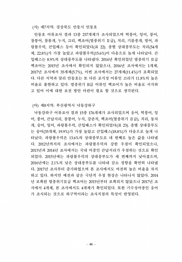 46 사 제7지역경상북도 안동시 안동호 안동호 어류조사 결과 13종 237개체가 조사되었으며 떡붕어, 잉어, 붕어, 참붕어, 참몰개, 누치, 끄리, 백조어 멸종위기 Ⅱ급 , 치리, 기름종개, 빙어, 파 랑볼우럭, 큰입배스 등이 확인되었다 표 22 종별 상대풍부도는 치리 54개 체, 22.8% 가 가장 높았고 파랑볼우럭 15.6% 이 다음으로 높게 나타났다. 큰 입배스는 8.9%의 상대풍부도를 나타냈다. 2014년 확인되었던 멸종위기 Ⅱ급 백조어는 2015년 조사에서 확인되지 않았으나, 2016년 조사에서는 1개체, 2017년 조사에서 35개체 5.7% , 이번 조사에서는 27개체 11.4% 가 포획되었 다. 다른 지역과 달리 안동호는 또 다른 포식성 어류인 끄리가 11.8%의 높은 비율로 출현하고 있다. 멸...