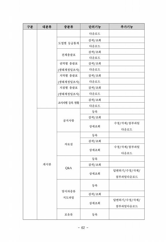 62 구분 대분류 중분류 단위기능 추가기능 다운로드 도엽별 등급통계 검색/조회 다운로드 전체총괄표 검색/조회 다운로드 권역별 총괄표 생태계정밀조사 검색/조회 다운로드 지역별 총괄표 생태계정밀조사 검색/조회 다운로드 지점별 총괄표 생태계정밀조사 검색/조회 다운로드 조사자별 등록 현황 검색/조회 다운로드 게시판 공지사항 등록 검색/조회 상세조회 수정/삭제/첨부파일 다운로드 자료실 등록 검색/조회 상세조회 수정/삭제/첨부파일 다운로드 Q&A 등록 검색/조회 상세조회 답변하기/수정/삭제/ 첨부파일다운로드 양서파충류 지도파일 등록 검색/조회 상세조회 답변하기/수정/삭제/ 첨부파일다운로드 포유류등록