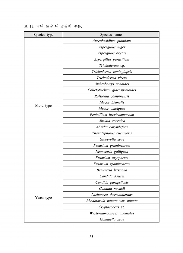 53 표 17. 국내 토양 내 곰팡이 종류. Species type Species name Mold type Aureobasidium pullulans Aspergillus niger Aspergillus oryzae Aspergillus parasiticus Trichoderma sp. Trichoderma koningiopsis Trichoderma virens Arthrobotrys conoides Colletotrichum gloeosporioides Ralstonia campinensis Mucor hiemalis Mucor ambiguus Penicillium brevicompactum Absidia coerulea Absidia corymbifera Thanatephorus cucumeris G...