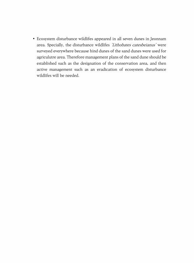 ? Ecosystem disturbance wildlifes appeared in all seven dunes in Jeonnam area. Specially, the disturbance wildlifes Lithobates catesbeianuswere surveyed everywhere because hind dunes of the sand dunes were used for agriculutre area. Therefore management plans of the sand dune should be established such as the designation of the conservation area, and then active management such as an eradication o...