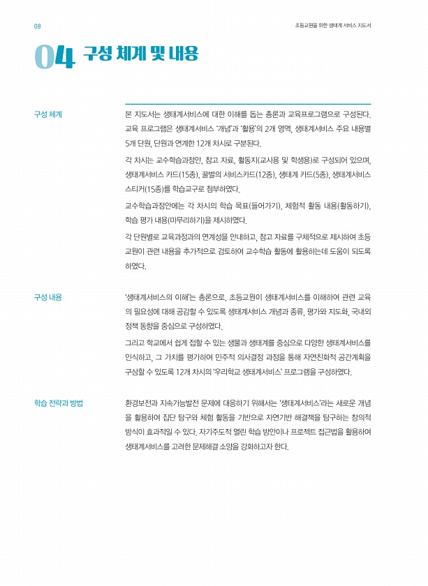 04? 구성 체계 및 내용 본 지도서는 생태계서비스에 대한 이해를 돕는 총론과 교육프로그램으로 구성된다. 교육 프로그램은 생태계서비스 ‘개념’과 ‘활용’의 2개 영역, 생태계서비스 주요 내용별 5개 단원, 단원과 연계한 12개 차시로 구분된다. 각 차시는 교수학습과정안, 참고 자료, 활동지 교사용 및 학생용 로 구성되어 있으며, 생태계서비스 카드 15종 , 꿀벌의 서비스카드 12종 , 생태계 카드 5종 , 생태계서비스 스티커 15종 를 학습교구로 첨부하였다. 교수학습과정안에는 각 차시의 학습 목표 들어가기 , 체험적 활동 내용 활동하기 , 학습 평가 내용 마무리하기 을 제시하였다. 각 단원별로 교육과정과의 연계성을 안내하고, 참고 자료를 구체적으로 제시하여 초등 교원이 관련 내용을 추가적으로 검토하여 교수학...