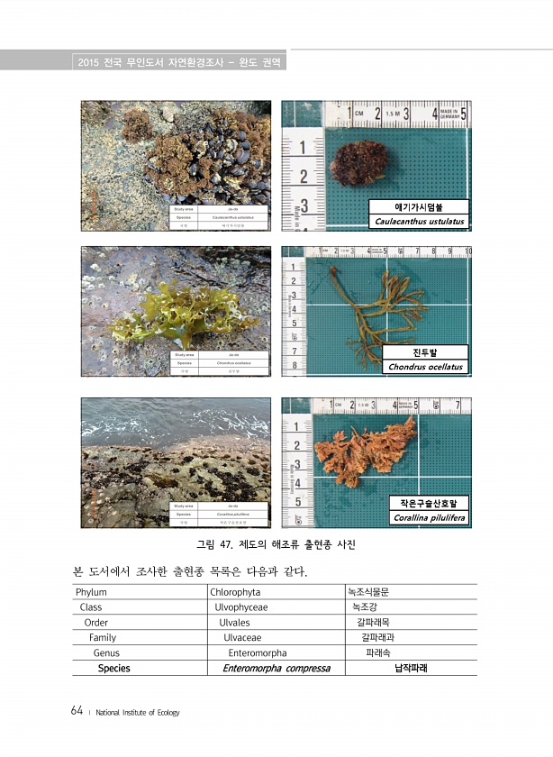 2015 전국 무인도서 자연환경조사 완도 권역 64 ? National Institute of Ecology 그림 47. 제도의 해조류 출현종 사진 본 도서에서 조사한 출현종 목록은 다음과 같다. Phylum Chlorophyta 녹조식물문 Class Ulvophyceae 녹조강 Order Ulvales 갈파래목 Family Ulvaceae 갈파래과 Genus Enteromorpha 파래속 Species Enteromorpha compressa납작파래