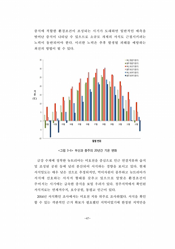 -47- 증식에 적합한 환경조건이 조성되는 시기가 도래하면 일반적인 예측을 벗어난 증식이 나타날 수 있으므로 소규모 개체의 서식도 근절시키려는 노력이 동반되어야 한다. 이러한 노력은 추후 발생될 피해를 예방하는 최선의 방법이 될 수 있다. 그림 3-6 부산과 충주의 20년간 기온 변화 금강 수계에 정착한 뉴트리아는 미호천을 중심으로 인근 연결지류와 습지 및 조성된 공원 등에 널리 분산되어 서식하는 경향을 보이고 있다. 현재 서식밀도는 매우 낮은 것으로 추정되지만, 먹이자원이 풍부하고 뉴트리아가 서식에 선호하는 서식지 형태를 갖추고 있으므로 알맞은 환경조건이 주어지는 시기에는 급속한 증식을 보일 우려가 있다. 청주지역에서 확인된 서식지로는 연제저수지, 호수공원, 동평교 인근이 있다. 2014년 서식확인 조사에...