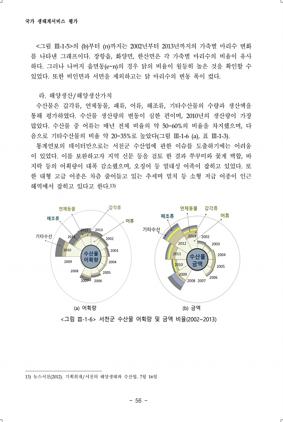 국가 생태계서비스 평가 56 그림 Ⅲ-1-5 의 b 부터 n 까지는 2002년부터 2013년까지의 가축별 마리수 변화 를 나타낸 그래프이다. 장항읍, 화양면, 한산면은 각 가축별 마리수의 비율이 유사 하다. 그러나 나머지 읍면동 en 의 경우 닭의 비율이 월등히 높은 것을 확인할 수 있었다. 또한 비인면과 서면을 제외하고는 닭 마리수의 변동 폭이 컸다. 라. 해양생산/해양생산가치 수산물은 갑각류, 연체동물, 패류, 어류, 해조류, 기타수산물의 수량과 생산액을 통해 평가하였다. 수산물 생산량의 변동이 심한 편이며, 2010년의 생산량이 가장 많았다. 수산물 중 어류는 매년 전체 비율의 약 5060%의 비율을 차지했으며, 다 음으로 기타수산물의 비율 약 2035%로 높았다 그림 Ⅲ-1-6 a , 표 Ⅲ-1-3 ...