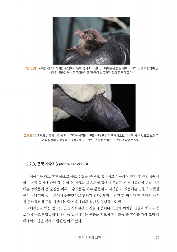 박쥐의 생태와 보전 73 6.2.8. 문둥이박쥐 Eptesicus serotinus 국내에서는 다소 흔한 종으로 주로 건물을 은신처, 휴식처로 이용하여 인가 및 산림 주변에 있는 건물 등에서 관찰 할 수 있다. 건물의 지붕과 벽 틈에서 무리를 지어 서식하며 번식 시기 에는 암컷들이 큰 군집을 이루고 수컷들은 따로 활동하고 서식한다. 겨울에는 건물의 따뜻한 곳이나 바위의 깊은 틈에서 동면한다고 알려져 있다. 새끼는 암컷 한 마리가 한 마리의 새끼 를 출산하는데 포육 기간에는 50마리 내외의 집단을 형성하기도 한다. 먹이활동을 하는 장소는 인간 생활환경인 건물 주변이나 인근에 위치한 산림과 계곡을 선 호하며 주로 딱정벌레나 나방 등 날아다니는 곤충을 먹으며 먹이활동 중 휴식을 위해 교량 아 래에서도 많은 개체가...