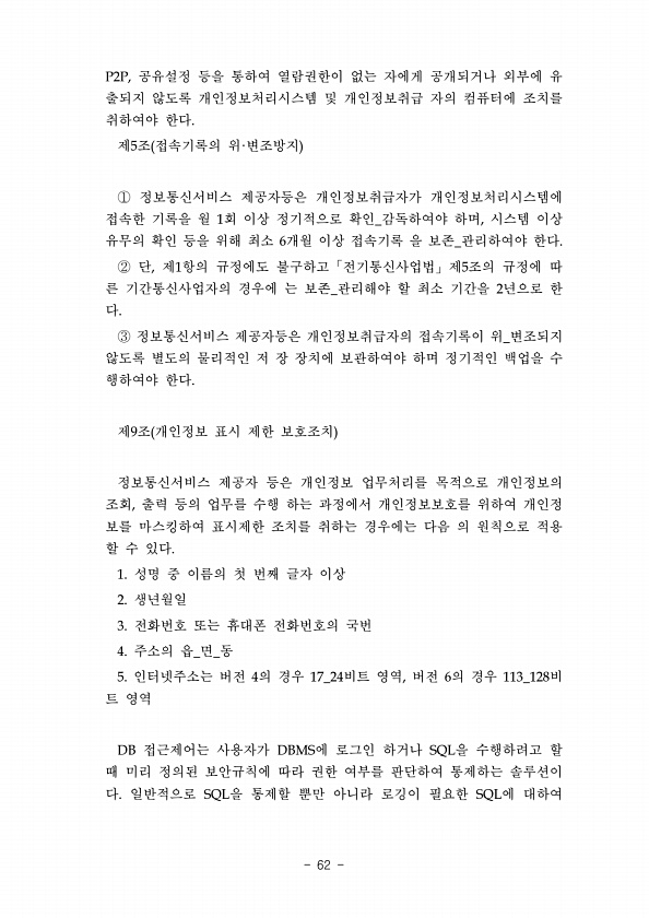 P2P, 공유설정 등을 통하여 열람권한이 없는 자에게 공개되거나 외부에 유 출되지 않도록 개인정보처리시스템 및 개인정보취급 자의 컴퓨터에 조치를 취하여야 한다. 제5조 접속기록의 위·변조방지 ① 정보통신서비스 제공자등은 개인정보취급자가 개인정보처리시스템에 접속한 기록을 월 1회 이상 정기적으로 확인_감독하여야 하며, 시스템 이상 유무의 확인 등을 위해 최소 6개월 이상 접속기록 을 보존_관리하여야 한다. ② 단, 제1항의 규정에도 불구하고「전기통신사업법」 제5조의 규정에 따 른 기간통신사업자의 경우에 는 보존_관리해야 할 최소 기간을 2년으로 한 다. ③ 정보통신서비스 제공자등은 개인정보취급자의 접속기록이 위_변조되지 않도록 별도의 물리적인 저 장 장치에 보관하여야 하며 정기적인 백업을 수 행하여야 한다. ...