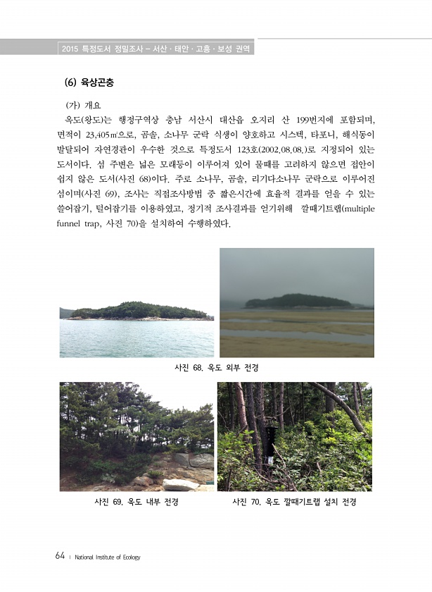 2015 특정도서 정밀조사 서산·태안·고흥·보성 권역 64 ? National Institute of Ecology 6 육상곤충 가 개요 옥도 왕도 는 행정구역상 충남 서산시 대산읍 오지리 산 199번지에 포함되며, 면적이 23,405㎡으로, 곰솔, 소나무 군락 식생이 양호하고 시스텍, 타포니, 해식동이 발달되어 자연경관이 우수한 것으로 특정도서 123호 2002.08.08. 로 지정되어 있는 도서이다. 섬 주변은 넓은 모래등이 이루어져 있어 물때를 고려하지 않으면 접안이 쉽지 않은 도서 사진 68 이다. 주로 소나무, 곰솔, 리기다소나무 군락으로 이루어진 섬이며 사진 69 , 조사는 직접조사방법 중 짧은시간에 효율적 결과를 얻을 수 있는 쓸어잡기, 털어잡기를 이용하였고, 정기적 조사결과를 얻기위해 깔때기트...