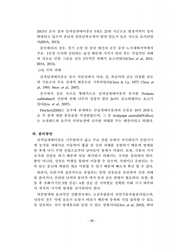 54 2013년 조사 결과 갈색날개매미충은 5개도 23개 시군으로 발생지역이 점차 확대되고 있으며 충남과 전라남북도에서 발생 밀도가 높은 것으로 조사되었 다 RDA, 2013 블루베리의 경우, 경기 고양 및 충남 예산과 공주 등의 노지재배지역에서 주로 1년생 가지에 산란하는 습성 때문에 가지가 말라 죽는 직접적인 피해 와 감로로 인한 그을음 같은 2차적인 피해가 보고되었다 Choi et al., 2011; RDA, 2013 나 국외 피해 갈색날개매미충은 중국 지린성에서 사과, 감, 복숭아와 같은 다양한 과수 와 가로수의 주요 경제적 해충으로 기록되었다 Chou & Lu, 1977; Chou et al., 1985; Shen et al., 2007 중국에서 같은 속으로 형태적으로 갈색날개매미충과 유사한 Poc...