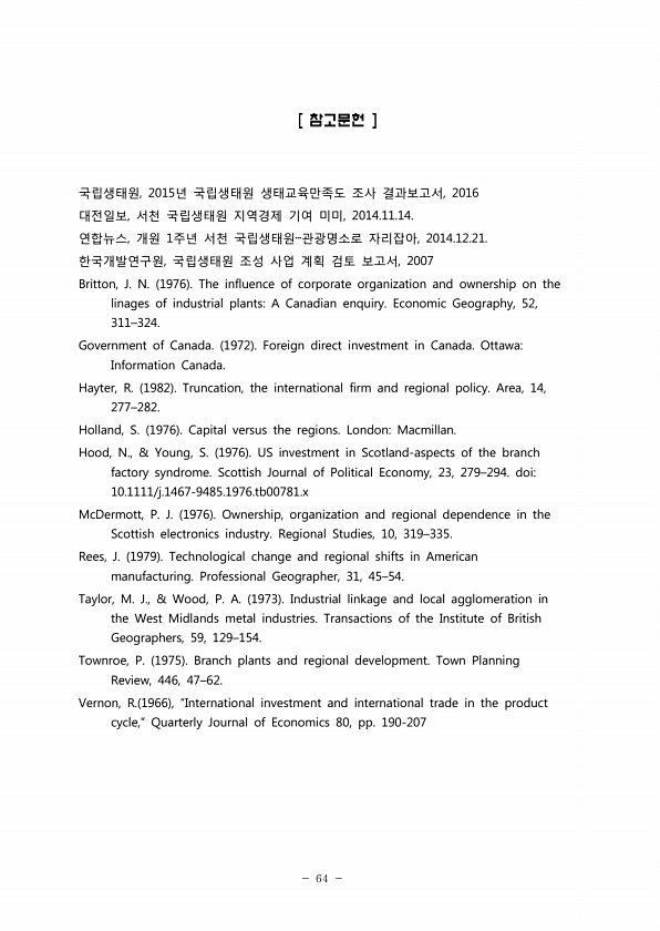 64 [ 참고문헌 ] 국립생태원, 2015년 국립생태원 생태교육만족도 조사 결과보고서, 2016 대전일보, 서천 국립생태원 지역경제 기여 미미, 2014.11.14. 연합뉴스, 개원 1주년 서천 국립생태원???관광명소로 자리잡아, 2014.12.21. 한국개발연구원, 국립생태원 조성 사업 계획 검토 보고서, 2007 Britton, J. N. 1976 The influence of corporate organization and ownership on the linages of industrial plantsA Canadian enquiry. Economic Geography, 52, 311?324. Government of Canada. 1972 Foreign direct investment in Cana...