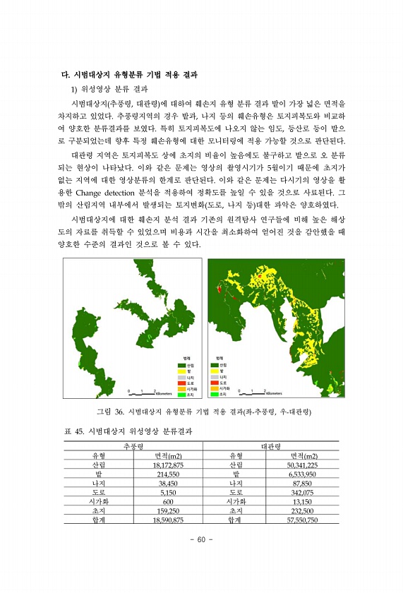60 다. 시범대상지 유형분류 기법 적용 결과 1 위성영상 분류 결과 시범대상지 추풍령, 대관령 에 대하여 훼손지 유형 분류 결과 밭이 가장 넓은 면적을 차지하고 있었다. 추풍령지역의 경우 밭과, 나지 등의 훼손유형은 토지피복도와 비교하 여 양호한 분류결과를 보였다. 특히 토지피복도에 나오지 않는 임도, 등산로 등이 밭으 로 구분되었는데 향후 특정 훼손유형에 대한 모니터링에 적용 가능할 것으로 판단된다. 대관령 지역은 토지피복도 상에 초지의 비율이 높음에도 불구하고 밭으로 오 분류 되는 현상이 나타났다. 이와 같은 문제는 영상의 촬영시기가 5월이기 때문에 초지가 없는 지역에 대한 영상분류의 한계로 판단된다. 이와 같은 문제는 다시기의 영상을 활 용한 Change detection 분석을 적용하여 정확도를 높...
