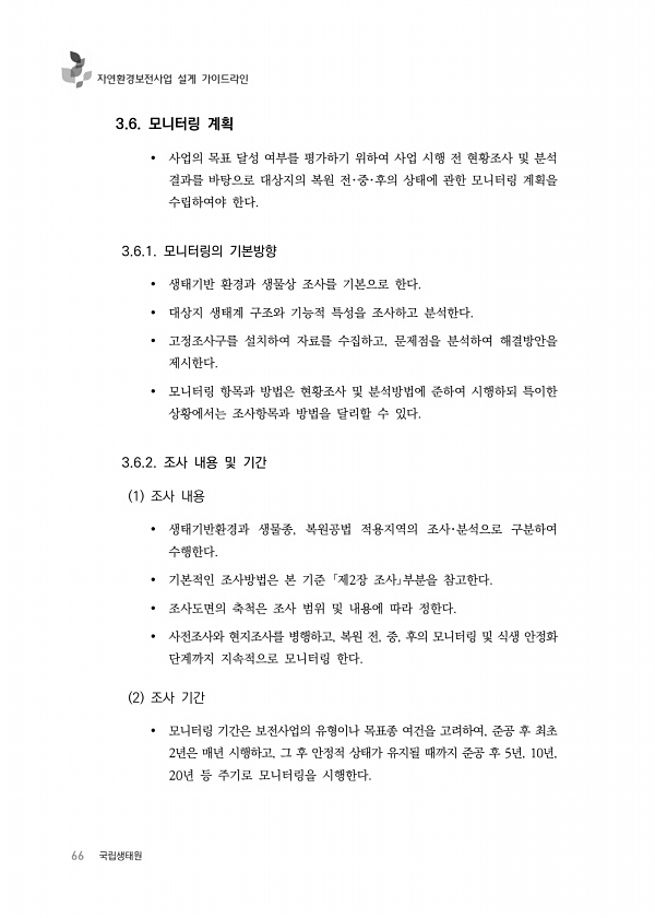 66 국립생태원 자연환경보전사업 설계 가이드라인 3.6. 모니터링 계획 사업의 목표 달성 여부를 평가하기 위하여 사업 시행 전 현황조사 및 분석 결과를 바탕으로 대상지의 복원 전?중?후의 상태에 관한 모니터링 계획을 수립하여야 한다. 3.6.1. 모니터링의 기본방향 생태기반 환경과 생물상 조사를 기본으로 한다. 대상지 생태계 구조와 기능적 특성을 조사하고 분석한다. 고정조사구를 설치하여 자료를 수집하고, 문제점을 분석하여 해결방안을 제시한다. 모니터링 항목과 방법은 현황조사 및 분석방법에 준하여 시행하되 특이한 상황에서는 조사항목과 방법을 달리할 수 있다. 3.6.2. 조사 내용 및 기간 1 조사 내용 생태기반환경과 생물종, 복원공법 적용지역의 조사?분석으로 구분하여 수행한다. 기본적인 조사방법은 본 기준 ...