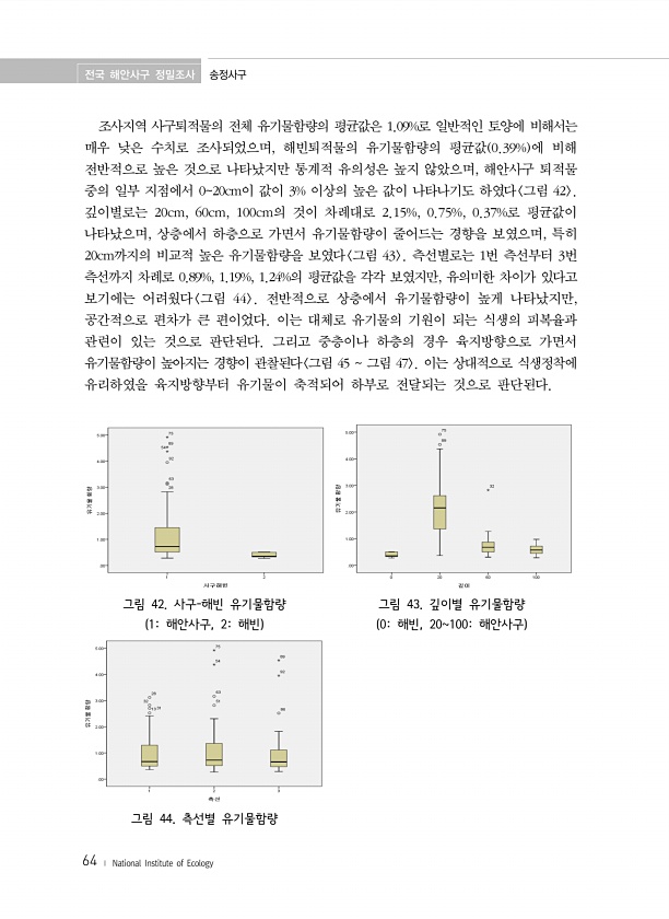 전국 해안사구 정밀조사 송정사구 64 ? National Institute of Ecology 조사지역 사구퇴적물의 전체 유기물함량의 평균값은 1.09%로 일반적인 토양에 비해서는 매우 낮은 수치로 조사되었으며, 해빈퇴적물의 유기물함량의 평균값 0.39% 에 비해 전반적으로 높은 것으로 나타났지만 통계적 유의성은 높지 않았으며, 해안사구 퇴적물 중의 일부 지점에서 020cm이 값이 3% 이상의 높은 값이 나타나기도 하였다 그림 42 깊이별로는 20cm, 60cm, 100cm의 것이 차례대로 2.15%, 0.75%, 0.37%로 평균값이 나타났으며, 상층에서 하층으로 가면서 유기물함량이 줄어드는 경향을 보였으며, 특히 20cm까지의 비교적 높은 유기물함량을 보였다 그림 43 측선별로는 1번 측선부터 3번 측선...