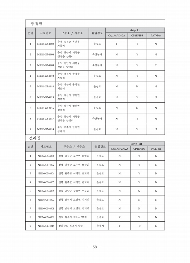 충청권 순번 시료번호 구주소 새주소 유입경로 strip kit Cry1Ac/Cry2A CP4EPSPS PAT/bar 1 NIE16-G3-4003 충북 옥천군 옥천읍 가풍리 운송로 Y Y N 2 NIE16-G3-4006 충남 천안시 서북구 성환읍 양령리 축산농가 N Y N 3 NIE16-G3-4008 충남 천안시 서북구 성환읍 양령리 축산농가 N Y Y 4 NIE16-G3-4010 충남 당진시 송악읍 가학리 운송로 N Y N 5 NIE16-G3-4014 충남 아산시 송악면 역촌리 운송로 N N N 6 NIE16-G3-4015 충남 아산시 영인면 신봉리 운송로 N Y N 7 NIE16-G3-4016 충남 아산시 영인면 신봉리 운송로 N N N 8 NIE16-G3-4017 충남 천안시 서북구 성환읍 양령리 축산농...
