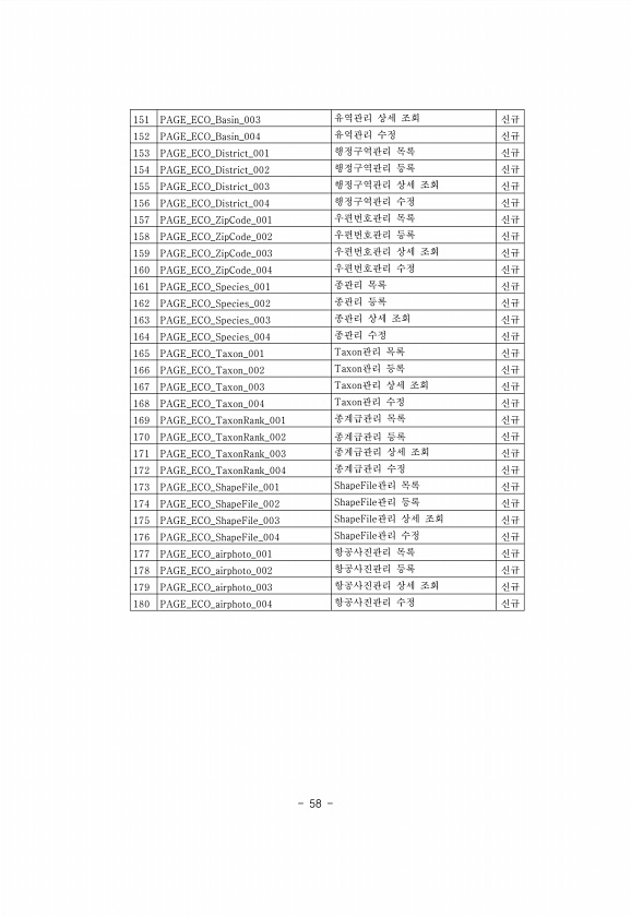 58 151 PAGE_ECO_Basin_003 유역관리 상세 조회 신규 152 PAGE_ECO_Basin_004 유역관리 수정 신규 153 PAGE_ECO_District_001 행정구역관리 목록 신규 154 PAGE_ECO_District_002 행정구역관리 등록 신규 155 PAGE_ECO_District_003 행정구역관리 상세 조회 신규 156 PAGE_ECO_District_004 행정구역관리 수정 신규 157 PAGE_ECO_ZipCode_001 우편번호관리 목록 신규 158 PAGE_ECO_ZipCode_002 우편번호관리 등록 신규 159 PAGE_ECO_ZipCode_003 우편번호관리 상세 조회 신규 160 PAGE_ECO_ZipCode_004 우편번호관리 수정 신규 161 PAGE_ECO...