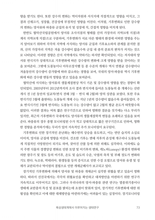 육상생태계에서 이루어지는 생태연구 73 향을 받기도 한다. 또한 강수의 변화는 먹이자원과 서식지에 직접적으로 영향을 미치고, 그 결과 신체크기, 성장률, 건강성에 부정적인 영향을 미친다. 이처럼, 기후변화로 인한 강수량 의 변화는 양서류와 파충류 군집의 유지 및 성장에 직, 간접적 영향을 미치게 된다. 한반도 월악산국립공원에서 양서류 조사지점의 형태를 산의 가장자리 지역 4개 지점 과 계곡 지역 4개 지점 으로 구분하여, 기후변화가 서로 다른 형태의 환경에 어떠한 영향을 주는 지 알아보기 위하여 각각의 지역에 서식하는 양서류 군집과 기후요소와의 관계를 분석한 결 과, 산의 가장자리 지역은 겨울 강수량이 많을수록 군집 내 종의 분포의 편차가 커지는 것으 로 나타났다. 이러한 경향은 산지 지역에서도 약하기는 하...