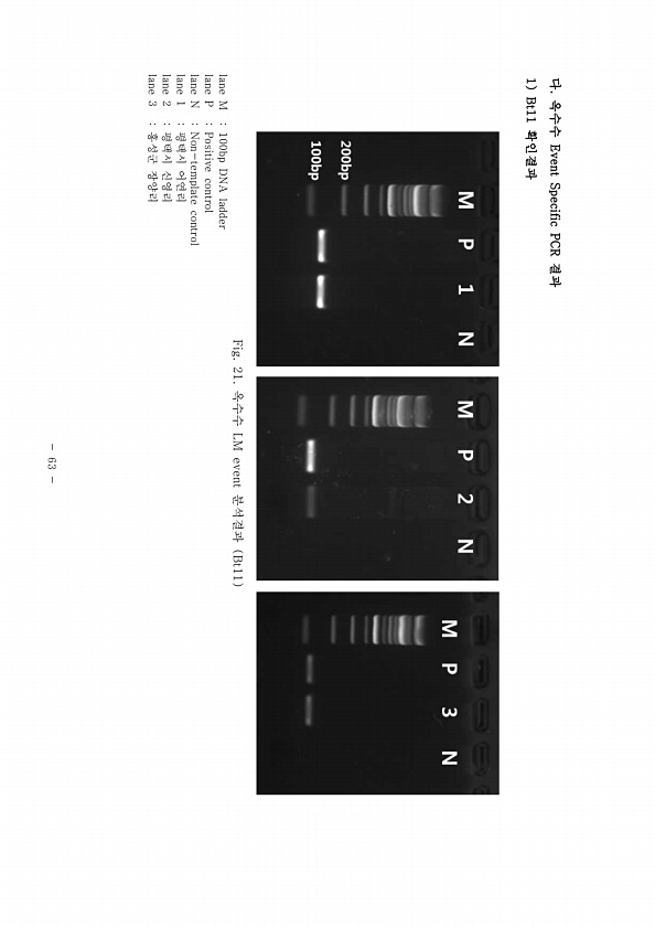 63 다. 옥수수 Event Specific PCR 결과 1 Bt11 확인결과 Fig. 21. 옥수수 LM event 분석결과 Bt11 lane M 100bp DNA ladder lane P Positive control lane N Non-template control lane 1 평택시 어연리 lane 2 평택시 신영리 lane 3 홍성군장양리