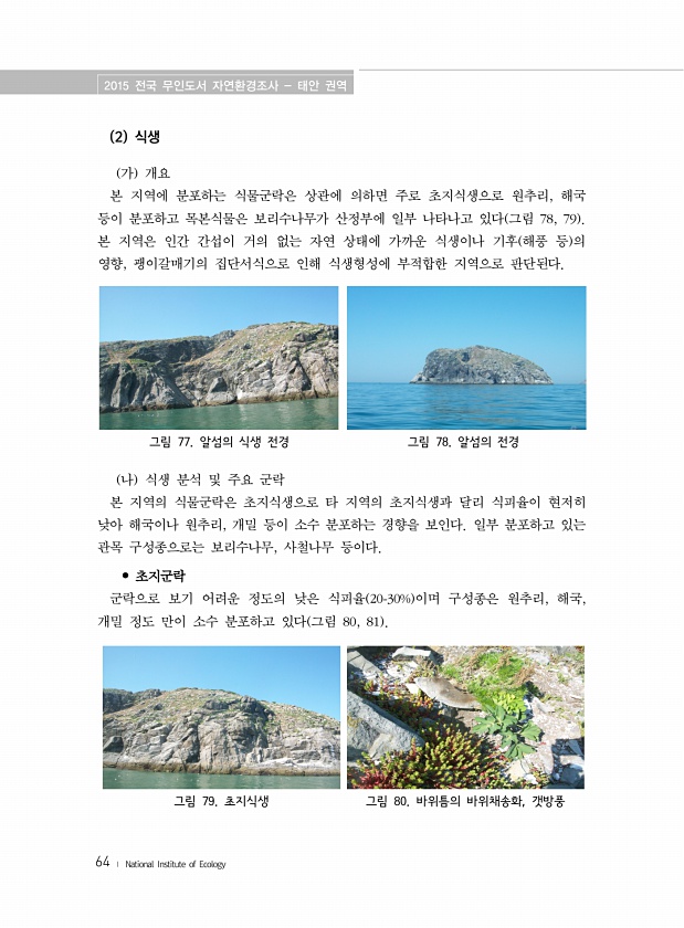 2015 전국 무인도서 자연환경조사 태안 권역 64 ? National Institute of Ecology 2 식생 가 개요 본 지역에 분포하는 식물군락은 상관에 의하면 주로 초지식생으로 원추리, 해국 등이 분포하고 목본식물은 보리수나무가 산정부에 일부 나타나고 있다 그림 78, 79 본 지역은 인간 간섭이 거의 없는 자연 상태에 가까운 식생이나 기후 해풍 등 의 영향, 괭이갈매기의 집단서식으로 인해 식생형성에 부적합한 지역으로 판단된다. 그림 77. 알섬의 식생 전경 그림 78. 알섬의 전경 나 식생 분석 및 주요 군락 본 지역의 식물군락은 초지식생으로 타 지역의 초지식생과 달리 식피율이 현저히 낮아 해국이나 원추리, 개밀 등이 소수 분포하는 경향을 보인다. 일부 분포하고 있는 관목 구성종으로는 보리수나...