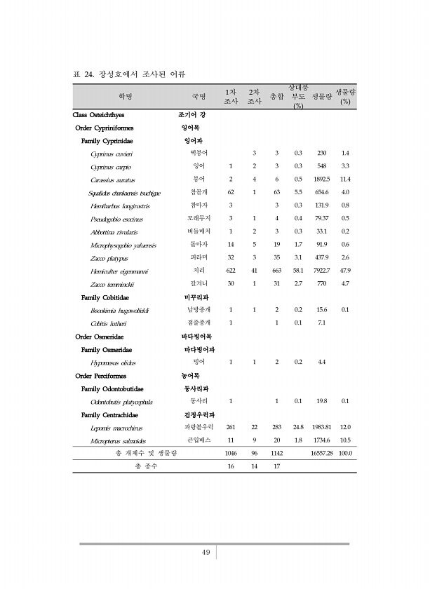 49 학명 국명 1차 조사 2차 조사 총합 상대풍 부도 % 생물량 생물량 % Class Osteichthyes 조기어 강 Order Cypriniformes 잉어목 Family Cyprinidae 잉어과 Cyprinus cuvieri 떡붕어 3 3 0.3 230 1.4 Cyprinus carpio 잉어 1 2 3 0.3 548 3.3 Carassius auratus 붕어 2 4 6 0.5 1892.5 11.4 Squalidus chankaensis tsuchigae 참몰개 62 1 63 5.5 654.6 4.0 Hemibarbus longirostris 참마자 3 3 0.3 131.9 0.8 Pseudogobio esocinus 모래무지 3 1 4 0.4 79.37 0.5 Abbottina rivularis...