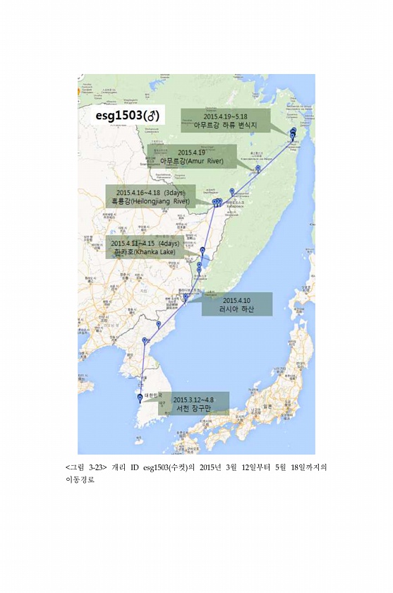 그림 3-23 개리 ID esg1503 수컷 의 2015년 3월 12일부터 5월 18일까지의이동경로