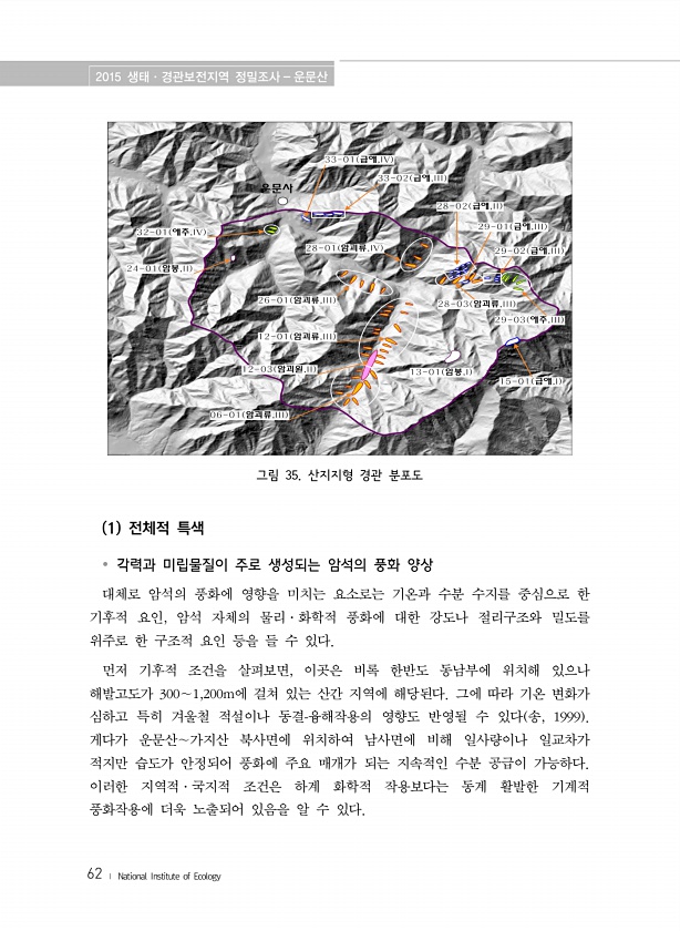 2015 생태·경관보전지역 정밀조사 운문산 62 ? National Institute of Ecology 그림 35. 산지지형 경관 분포도 1 전체적 특색 각력과 미립물질이 주로 생성되는 암석의 풍화 양상 대체로 암석의 풍화에 영향을 미치는 요소로는 기온과 수분 수지를 중심으로 한 기후적 요인, 암석 자체의 물리·화학적 풍화에 대한 강도나 절리구조와 밀도를 위주로 한 구조적 요인 등을 들 수 있다. 먼저 기후적 조건을 살펴보면, 이곳은 비록 한반도 동남부에 위치해 있으나 해발고도가 300∼1,200m에 걸쳐 있는 산간 지역에 해당된다. 그에 따라 기온 변화가 심하고 특히 겨울철 적설이나 동결-융해작용의 영향도 반영될 수 있다 송, 1999 게다가 운문산∼가지산 북사면에 위치하여 남사면에 비해 일사량이나 일교...