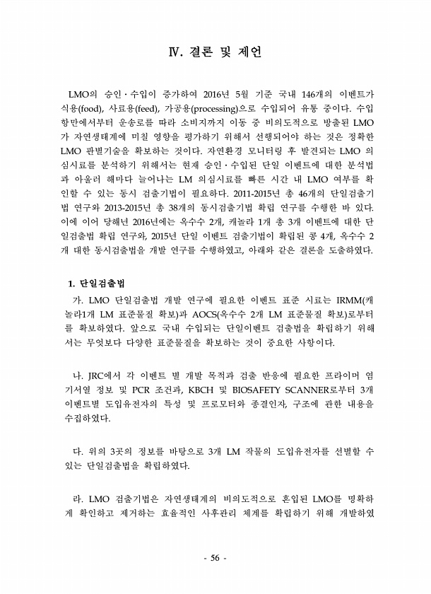 56 Ⅳ. 결론 및 제언 LMO의 승인?수입이 증가하여 2016년 5월 기준 국내 146개의 이벤트가 식용 food , 사료용 feed , 가공용 processing 으로 수입되어 유통 중이다. 수입 항만에서부터 운송로를 따라 소비지까지 이동 중 비의도적으로 방출된 LMO 가 자연생태계에 미칠 영향을 평가하기 위해서 선행되어야 하는 것은 정확한 LMO 판별기술을 확보하는 것이다. 자연환경 모니터링 후 발견되는 LMO 의 심시료를 분석하기 위해서는 현재 승인?수입된 단일 이벤트에 대한 분석법 과 아울러 해마다 늘어나는 LM 의심시료를 빠른 시간 내 LMO 여부를 확 인할 수 있는 동시 검출기법이 필요하다. 2011-2015년 총 46개의 단일검출기 법 연구와 2013-2015년 총 38개의 동시검출기법 확립 ...