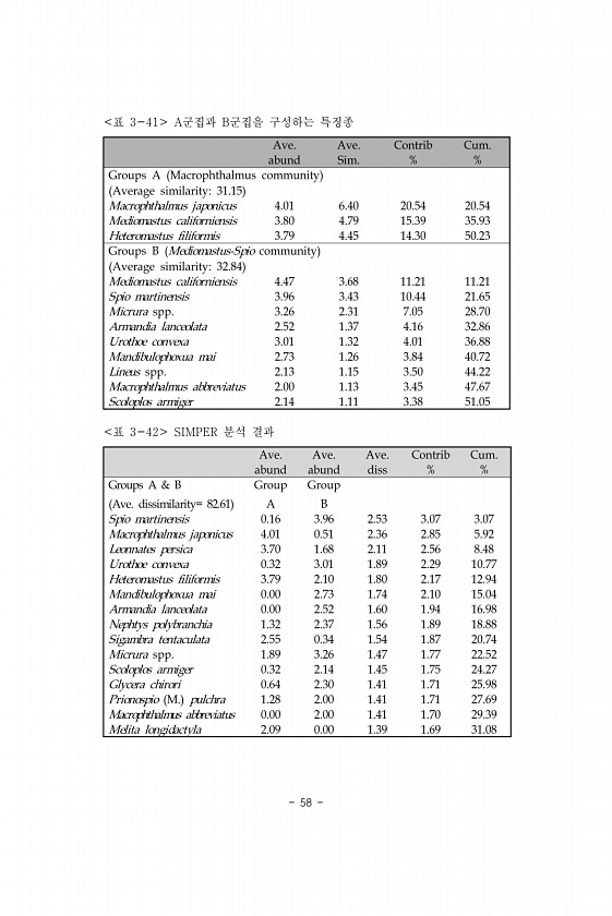58 Ave. Ave. Contrib Cum. abund Sim. % % Groups A Macrophthalmus community Average similarity31.15 Macrophthalmus japonicus 4.01 6.40 20.54 20.54 Mediomastus californiensis 3.80 4.79 15.39 35.93 Heteromastus filiformis 3.79 4.45 14.30 50.23 Groups B Mediomastus-Spio community Average similarity32.84 Mediomastus californiensis 4.47 3.68 11.21 11.21 Spio martinensis 3.96 3.43 10.44 21.65 Micrura spp...