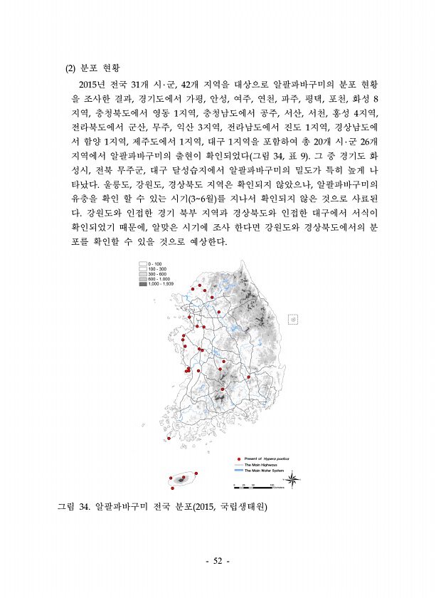 52 2 분포 현황 2015년 전국 31개 시?군, 42개 지역을 대상으로 알팔파바구미의 분포 현황 을 조사한 결과, 경기도에서 가평, 안성, 여주, 연천, 파주, 평택, 포천, 화성 8 지역, 충청북도에서 영동 1지역, 충청남도에서 공주, 서산, 서천, 홍성 4지역, 전라북도에서 군산, 무주, 익산 3지역, 전라남도에서 진도 1지역, 경상남도에 서 함양 1지역, 제주도에서 1지역, 대구 1지역을 포함하여 총 20개 시?군 26개 지역에서 알팔파바구미의 출현이 확인되었다 그림 34, 표 9 그 중 경기도 화 성시, 전북 무주군, 대구 달성습지에서 알팔파바구미의 밀도가 특히 높게 나 타났다. 울릉도, 강원도, 경상북도 지역은 확인되지 않았으나, 알팔파바구미의 유충을 확인 할 수 있는 시기 36월 를 지나서 확...