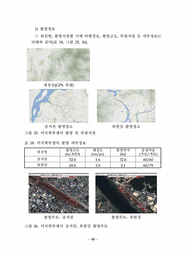 48 제청천 GPS 측량 공지천 촬영장소 북한강 촬영장소 1 촬영정보 ○ 하천별, 촬영지점별 기체 비행경로, 촬영고도, 측량지점 등 세부정보는 아래와 같다 표 18, 그림 25, 26 그림 25. 미국쑥부쟁이 촬영 및 측량지점 표 18. 미국쑥부쟁이 촬영 세부정보 하천명 촬영고도 m/ATO 해상도 cm/px 촬영면적 ha 중첩비율 가로/세로 공지천 52.0 1.6 32.6 60/60 북한강 65.0 2.0 2.1 60/75 촬영루트- 공지천 촬영루트- 북한강 그림 26. 미국쑥부쟁이 공지천, 북한강촬영루트
