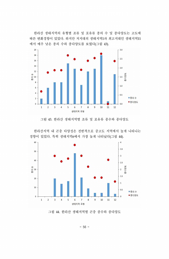 56 한라산 생태지역의 유형별 조류 및 포유류 종의 수 및 종다양도는 고도에 따른 변화경향이 있었다. 하지만 저지대의 생태지역1과 최고지대인 생태지역11 에서 매우 낮은 종의 수와 종다양도를 보였다 그림 43 그림 43. 한라산 생태지역별 조류 및 포유류 종수와 종다양도 한라산지역 내 곤충 다양성은 전반적으로 중고도 지역에서 높게 나타나는 경향이 있었다. 특히 생태지역6에서 가장 높게 나타났다 그림 44 그림 44. 한라산 생태지역별 곤충 종수와종다양도