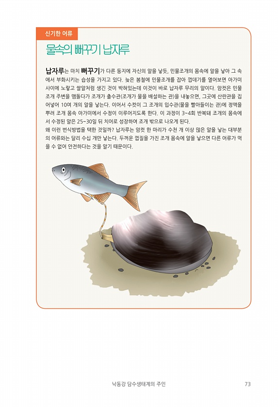 낙동강 담수생태계의 주인 73 신기한 어류 납자루는 마치 뻐꾸기가 다른 둥지에 자신의 알을 낳듯, 민물조개의 몸속에 알을 낳아 그 속 에서 부화시키는 습성을 가지고 있다. 늦은 봄철에 민물조개를 잡아 껍데기를 열어보면 아가미 사이에 노랗고 쌀알처럼 생긴 것이 박혀있는데 이것이 바로 납자루 무리의 알이다. 암컷은 민물 조개 주변을 맴돌다가 조개가 출수관 조개가 물을 배설하는 관 을 내놓으면, 그곳에 산란관을 집 어넣어 10여 개의 알을 낳는다. 이어서 수컷이 그 조개의 입수관 물을 빨아들이는 관 에 정액을 뿌려 조개 몸속 아가미에서 수정이 이루어지도록 한다. 이 과정이 34회 반복돼 조개의 몸속에 서 수정된 알은 2530일 뒤 치어로 성장하여 조개 밖으로 나오게 된다. 왜 이런 번식방법을 택한 것일까? 납자루...