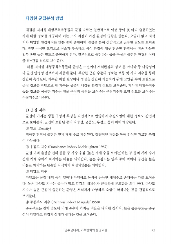 담수생태계, 기후변화와 환경교란 73 다양한 군집분석 방법 채집된 저서성 대형무척추동물의 군집 자료는 일반적으로 어떤 종이 몇 마리 출현하였는 가에 대한 정보를 제공하며 이는 조사 지점이 가진 환경에 영향을 받는다. 오염이 없고 서식 처가 다양한 환경에서는 많은 종이 출현하며 경쟁을 통해 전반적으로 균등한 밀도를 보여준 다. 반면 극심한 오염으로 산소가 부족하고 서식 환경이 매우 단순한 환경에는 생존 가능한 일부 종만 높은 밀도로 출현하게 된다. 결론적으로 출현하는 생물 구성은 출현한 환경의 상태 를 직-간접 적으로 보여준다. 하천 저서성 대형무척추동물의 군집은 수질이나 서식환경의 정보 뿐 아니라 종 다양성이 나 군집 안정성 정보까지 제공해 준다. 복잡한 군집 수준의 정보는 보통 몇 가지 지수를 통해 간단히...