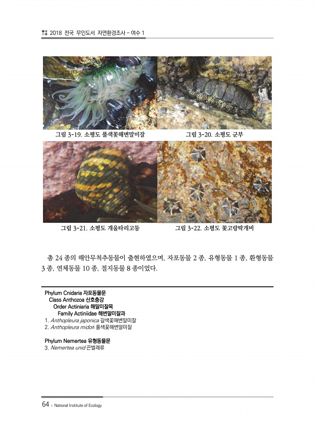 2018 전국 무인도서 자연환경조사 여수 1 64 ? National Institute of Ecology 그림 3-19. 소평도 풀색꽃해변말미잘 그림 3-20. 소평도 군부 그림 3-21. 소평도 개울타리고둥 그림 3-22. 소평도 꽃고랑딱개비 총 24 종의 해안무척추동물이 출현하였으며, 자포동물 2 종, 유형동물 1 종, 환형동물 3 종, 연체동물 10 종, 절지동물 8 종이었다. Phylum Cnidaria 자포동물문 Class Anthozoa 산호충강 Order Actiniaria 해말미잘목 Family Actiniidae 해변말미잘과 1. Anthopleura japonica 갈색꽃해변말미잘 2. Anthopleura midori 풀색꽃해변말미잘 Phylum Nemertea 유형동물문 3. Neme...