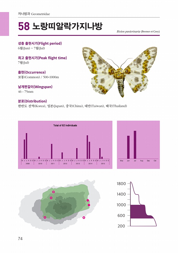 74 자나방과 Geometridae 성충 출현시기 Flight period 6월 Jun 7월 Jul 최고 출현시기 Peak fight time 7월 Jul 출현 Occurrence 보통 Common 500-1000m 날개편길이 Wingspan 46 75mm 분포 Distribution 한반도 전역 Korea , 일본 Japan , 중국 China , 대만 Taiwan , 태국 Thailand 58 노랑띠알락가지나방 Biston panterinaria Bremer et Grey M J J A S O M J J A S O M J J A S O M J J A S O M J J A S O M J J A S O M J J A S O May Jun Jul Aug Sep Oct 2009 2010 2011 2012 201...
