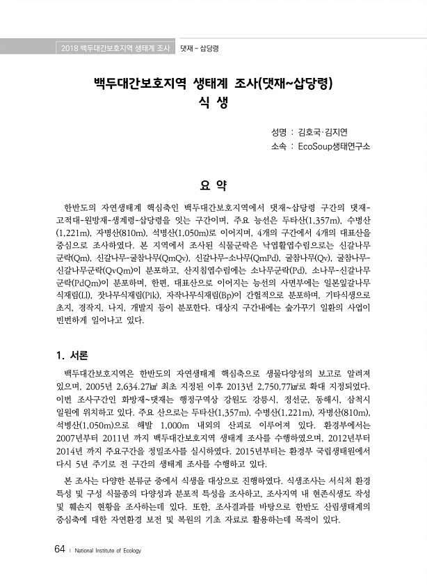 2018 백두대간보호지역 생태계 조사 댓재 삽당령 64 ? National Institute of Ecology 백두대간보호지역 생태계 조사 댓재삽당령 식 생 성명 김호국·김지연 소속 EcoSoup생태연구소 요 약 한반도의 자연생태계 핵심축인 백두대간보호지역에서 댓재삽당령 구간의 댓재- 고적대-원방재-생계령-삽당령을 잇는 구간이며, 주요 능선은 두타산 1,357m , 수병산 1,221m , 자병산 810m , 석병산 1,050m 로 이어지며, 4개의 구간에서 4개의 대표산을 중심으로 조사하였다. 본 지역에서 조사된 식물군락은 낙엽활엽수림으로는 신갈나무 군락 Qm , 신갈나무-굴참나무 QmQv , 신갈나무-소나무 QmPd , 굴참나무 Qv , 굴참나무- 신갈나무군락 QvQm 이 분포하고, 산지침엽수림에는 소나...