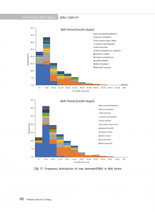 2018 백두대간 생태계 정밀조사 응복산 고정조사구 66 ? National Institute of Ecology 그림 17. Frequency distribution of tree diameter DBH in Beltforest