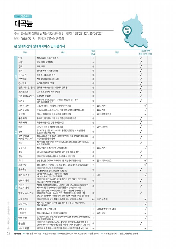 No. 창녕- 창녕 031 본 생태자산의 생태계서비스 간이평가지 구분 예시 평가 등급 설명 규모별 혜택 지점 지역 국가 공급 담수 식수, 농업용수, 축산 용수 등 + √ 식량 곡물, 과실, 물고기 등 + √ 연료 화목, 토탄 0 √ 섬유 건축용 목재, 의류용 섬유 등 0 √ 유전자원 농업·축산업 희귀품종 등 0 √ 천연약재 전통 의약품에 사용되는 식물 0 √ 장식재료 수집용 조개껍질, 꽃 등 0 √ 진흙, 미네랄, 골재 건축용 모래 또는 자갈, 벽돌재료 진흙 등 0 √ 폐기물처리 고체 쓰레기 하치, 폐수 방류 등 0 √ 친환경에너지발전 조력발전, 풍력발전 0 √ 조절 대기질 자동차 배기가스, 산업체 대기오염, 농업발생 먼지 등의 대기 미세물질의 제거 0 √ 지역적 기후 그늘, 대기온도 저하 등의 지역 미세기...