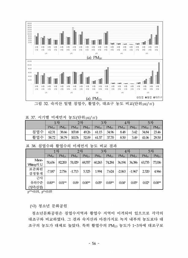 56 a PM10 a PM2.5 그림 32. 숙지산 일별 침엽수, 활엽수, 대조구 농도 비교 단위㎍/㎥ 1차 2차 3차 4차 5차 PM10 PM2.5 PM10 PM2.5 PM10 PM2.5 PM10 PM2.5 PM10 PM2.5 침엽수 62.31 38.66 107.68 48.26 61.15 34.86 8.48 3.42 34.84 23.46 활엽수 58.72 38.78 100.76 52.08 61.57 37.70 8.50 3.48 41.06 28.50 표 37. 시기별 미세먼지 농도 단위㎍/㎥ 1차 2차 3차 4차 5차 PM10 PM2.5 PM10 PM2.5 PM10 PM2.5 PM10 PM2.5 PM10 PM2.5 MannWhitney의 U 51,636 82,200 51,028 68,557 60,263 74...
