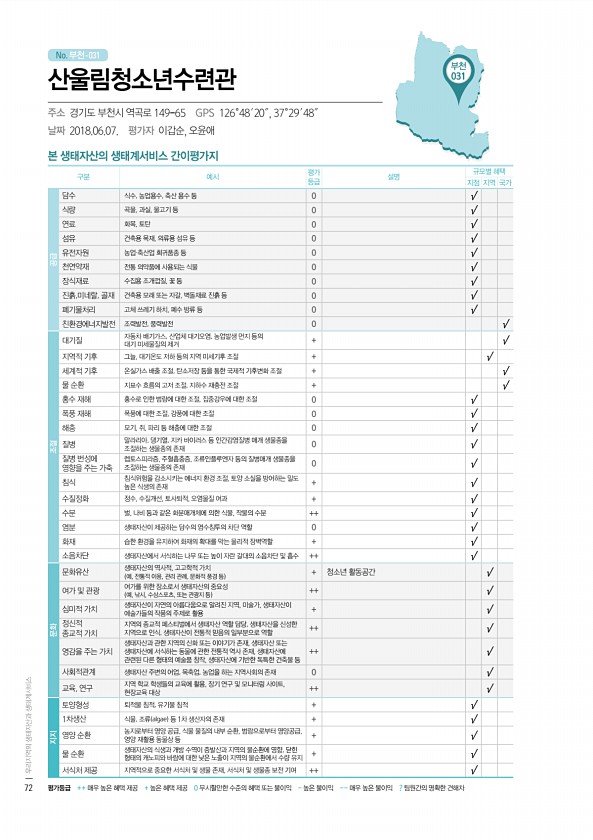 No. 부천- 본 생태자산의 생태계서비스 간이평가지 구분 예시 평가 등급 설명 규모별 혜택 지점 지역 국가 공급 담수 식수, 농업용수, 축산 용수 등 0 √ 식량 곡물, 과실, 물고기 등 0 √ 연료 화목, 토탄 0 √ 섬유 건축용 목재, 의류용 섬유 등 0 √ 유전자원 농업·축산업 희귀품종 등 0 √ 천연약재 전통 의약품에 사용되는 식물 0 √ 장식재료 수집용 조개껍질, 꽃 등 0 √ 진흙,미네랄, 골재 건축용 모래 또는 자갈, 벽돌재료 진흙 등 0 √ 폐기물처리 고체 쓰레기 하치, 폐수 방류 등 0 √ 친환경에너지발전 조력발전, 풍력발전 0 √ 조절 대기질 자동차 배기가스, 산업체 대기오염, 농업발생 먼지 등의 대기 미세물질의 제거 + √ 지역적 기후 그늘, 대기온도 저하 등의 지역 미세기후 조절 + √...
