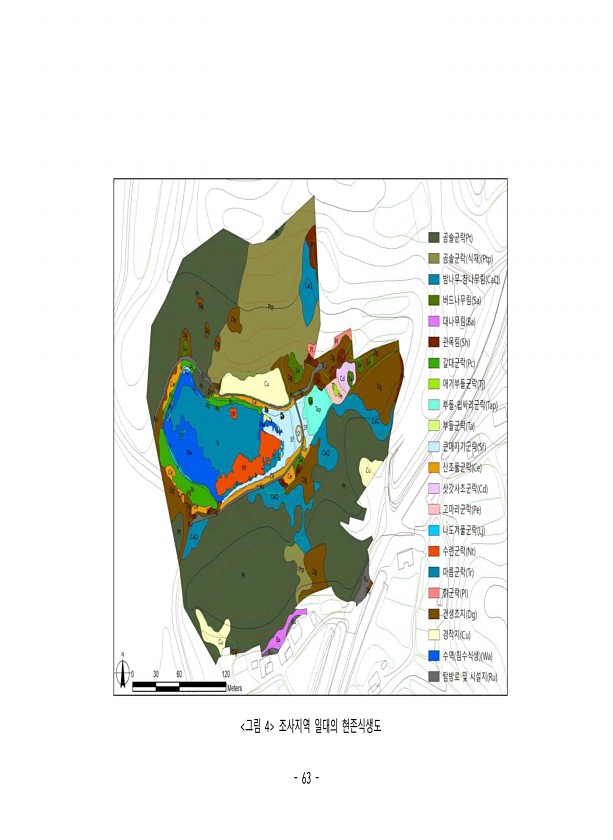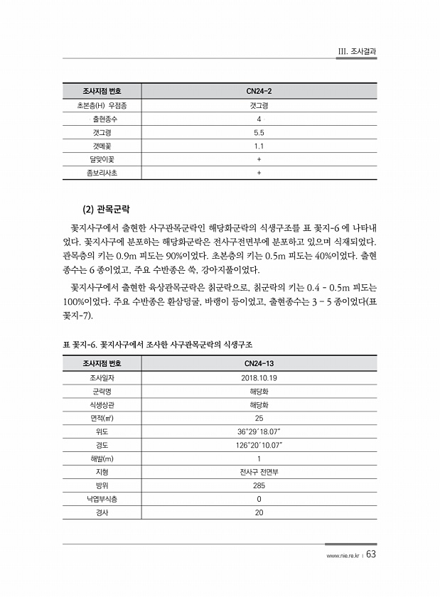 III. 조사결과 www.nie.re.kr ? 63 2 꽃지사구에서 출현한 사구관목군락인 해당화군락의 식생구조를 표 꽃지-6 에 나타내 었다. 꽃지사구에 분포하는 해당화군락은 전사구전면부에 분포하고 있으며 식재되었다. 관목층의 키는 0.9m 피도는 90%이었다. 초본층의 키는 0.5m 피도는 40%이었다. 출현 종수는 6 종이었고, 주요 수반종은 쑥, 강아지풀이었다. 꽃지사구에서 출현한 육상관목군락은 칡군락으로, 칡군락의 키는 0.4 0.5m 피도는 100%이었다. 주요 수반종은 환삼덩굴, 바랭이 등이었고, 출현종수는 3 ? 5 종이었다 표 꽃지-7 조사지점 번호 CN24-2 초본층 H 우점종 갯그령 출현종수 4 갯그령 5.5 갯메꽃 1.1 달맞이꽃 + 좀보리사초 + 조사지점 번호 CN24-13 조사일자...