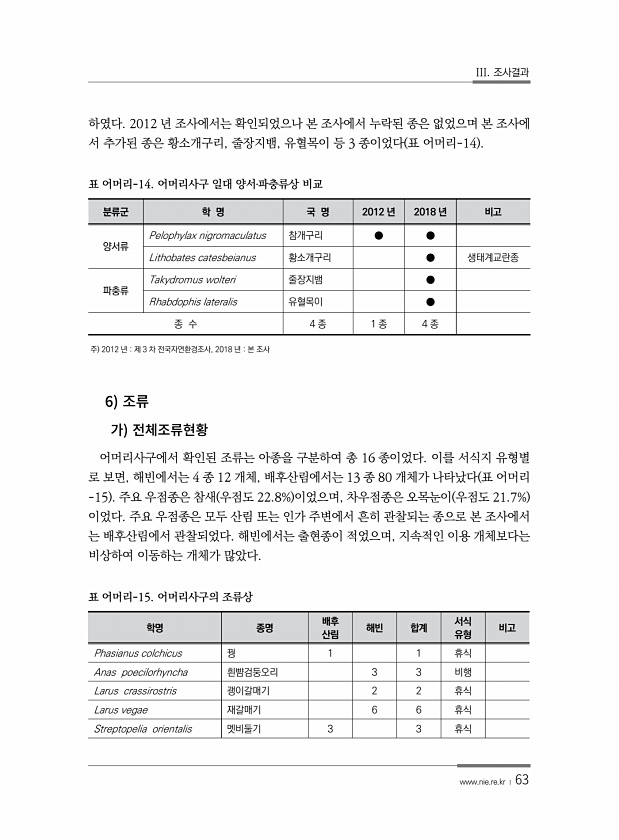 III. 조사결과 www.nie.re.kr ? 63 하였다. 2012 년 조사에서는 확인되었으나 본 조사에서 누락된 종은 없었으며 본 조사에 서 추가된 종은 황소개구리, 줄장지뱀, 유혈목이 등 3 종이었다 표 어머리-14 분류군 학 명 국 명 2012 년 2018 년 비고 양서류 Pelophylax nigromaculatus 참개구리 ● ● Lithobates catesbeianus 황소개구리 ● 생태계교란종 파충류 Takydromus wolteri 줄장지뱀 ● Rhabdophis lateralis 유혈목이 ● 종 수 4 종 1 종 4 종 표 어머리-14. 어머리사구 일대 양서?파충류상 비교 주 2012 년 제 3 차 전국자연환경조사, 2018 년 본 조사 6 어머리사구에서 확인된 조류는 아종을 구분하여 총...