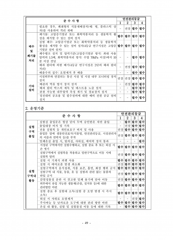 49 2. 운영기준 준 수 사 항 안전관리등급 1 2 3 4 필요한 경우, 폐쇄형의 식물재배장치 예병, 플라스틱 상 자 를 사용하여 격리 재배 권장 필수 필수 배수 및 폐기물 처리 폐기물고압증기멸균 또는 화학약품처리 등 생물학적 활 성을 제거할 수 있는 설비 설치 필수 필수 필수 필수 실험 폐수고압증기멸균 또는 화학약품처리 등 생물학적 활성을 제거할 수 있는 설비 설치 4등급 연구시설은 고압증 기멸균 설비 설치 필수 필수 필수 필수 폐수탱크 설치 및 압력기준 고압증기멸균 방식최대 사용 압력의 1.5배, 화학약품처리 방식수압 70kPa 이상 에서 10 분 이상 견딤 필수 필수 헤파 필터에 의한 배기 4등급 연구시설은 2단의 헤파 필터 처리 권장 필수 필수 배출수의 집수오염제거 후 배출 필수 필수 기타 설비 시...