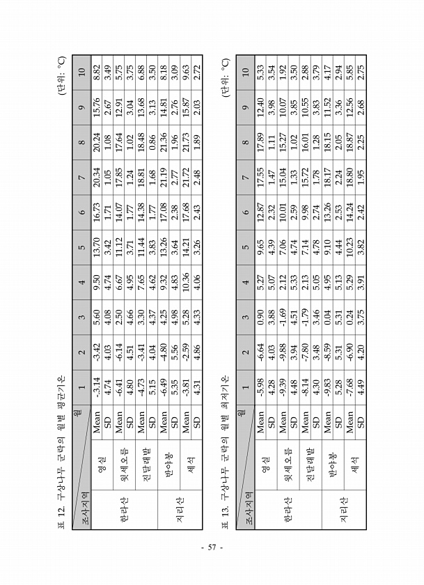 월 조사지역 1 2 3 4 5 6 7 8 9 10 한라산 영실 Mean -.3.14 -3.42 5.60 9.50 13.70 16.73 20.34 20.24 15.76 8.82 SD 4.74 4.03 4.08 4.74 3.42 1.71 1.05 1.08 2.67 3.49 윗세오름 Mean -6.41 -6.14 2.50 6.67 11.12 14.07 17.85 17.64 12.91 5.75 SD 4.80 4.51 4.66 4.95 3.71 1.77 1.24 1.02 3.04 3.75 진달래밭 Mean -4.73 -3.41 3.30 7.65 11.44 14.38 18.81 18.48 13.68 6.88 SD 5.15 4.04 4.37 4.62 3.83 1.77 1.68 0.86 3.13 3.50 지리산 반야봉 M...
