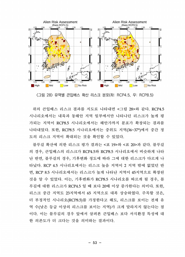 53 그림 28 유역별 큰입배스 확산 리스크 분포 좌RCP4.5, 우RCP8.5 위의 큰입배스 리스크 결과를 지도로 나타내면 그림 28 와 같다. RCP4.5 시나리오에서는 내륙과 동해안 지역 일부에서만 나타나던 리스크가 높게 평 가되는 지역이 RCP8.5 시나리오에서는 해안가까지 분포가 확장되는 결과를 나타내었다. 또한, RCP8.5 시나리오에서는 중위도 지역 3637° 에서 중간 정 도의 리스크 지역이 확대되는 것을 확인할 수 있었다. 블루길 확산에 의한 리스크 평가 결과는 표 19 와 표 20 과 같다. 블루길 의 경우, 큰입배스의 리스크가 RCP4.5와 RCP8.5 시나리오에서 비슷하게 나타 난 반면, 블루길의 경우, 기후변화 정도에 따라 그에 대한 리스크가 다르게 나 타났다. RCP 4.5 시나리오...