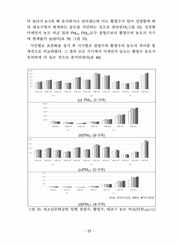 57 다 높다가 45차 때 유사하거나 낮아졌는데 이는 활엽수가 잎이 성장함에 따 라 대조구에서 발생하는 농도를 저감하는 것으로 판단된다 그림 33 성상별 미세먼지 농도 비교 결과 PM10, PM2.5모두 침엽수보다 활엽수의 농도가 시기 에 관계없이 높았다 표 38그림 33 시간별로 표준화를 실시 후 시기별로 침엽수와 활엽수의 농도의 차이를 통 계적으로 비교하였다. 그 결과 모든 시기에서 미세먼지 농도는 활엽수 농도가 유의하게 더 높은 것으로 분석되었다 표 40 J PM10 13차 F PM10 45차 K PM2.5 13차 Q PM2.5 45차 그림 33. 청소년문화공원 일별 침엽수, 활엽수, 대조구 농도 비교 단위㎍/㎥