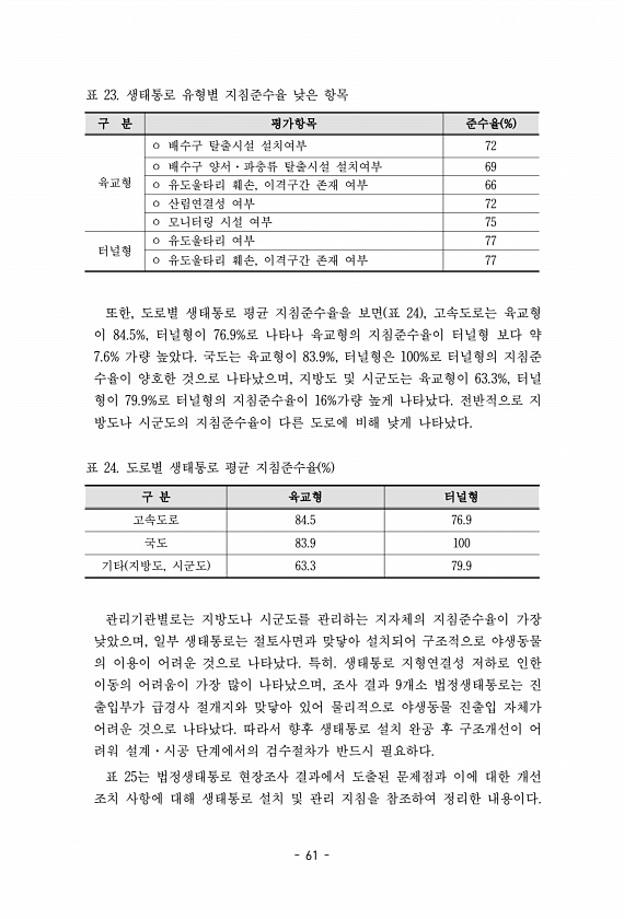 61 구 분 평가항목 준수율 % 육교형 ㅇ 배수구 탈출시설 설치여부 72 ㅇ 배수구 양서·파충류 탈출시설 설치여부 69 ㅇ 유도울타리 훼손, 이격구간 존재 여부 66 ㅇ 산림연결성 여부 72 ㅇ 모니터링 시설 여부 75 터널형 ㅇ 유도울타리 여부 77 ㅇ 유도울타리 훼손, 이격구간 존재 여부 77 표 23. 생태통로 유형별 지침준수율 낮은 항목 또한, 도로별 생태통로 평균 지침준수율을 보면 표 24 , 고속도로는 육교형 이 84.5%, 터널형이 76.9%로 나타나 육교형의 지침준수율이 터널형 보다 약 7.6% 가량 높았다. 국도는 육교형이 83.9%, 터널형은 100%로 터널형의 지침준 수율이 양호한 것으로 나타났으며, 지방도 및 시군도는 육교형이 63.3%, 터널 형이 79.9%로 터널형의 지침준수율이 1...