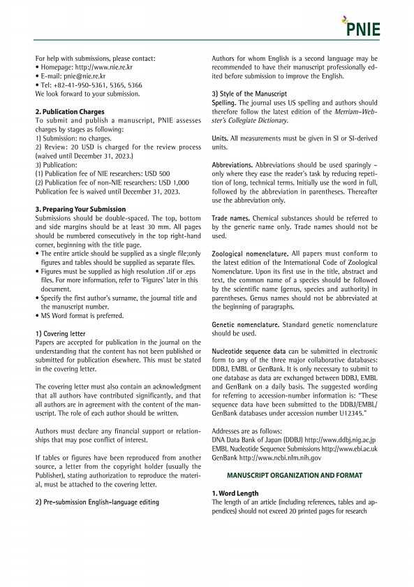 For help with submissions, please contact? Homepagehttp//www.nie.re.kr ? E-mailpnie@nie.re.kr ? Tel+82-41-950-5361, 5365, 5366 We look forward to your submission. 2. Publication Charges To submit and publish a manuscript, PNIE assesses charges by stages as following1 Submissionno charges. 2 Review20 USD is charged for the review process waived until December 31, 2023. 3 Publication1 Publication fe...